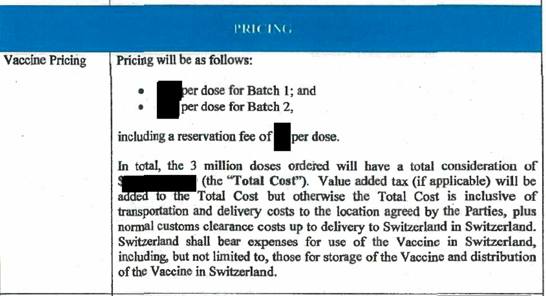 Der Preis ist auch in diesen Dokumenten immer noch geschwärzt. Neben dem Preis pro Dosis gab es noch eine Reservierungsgebühr oben drauf + potentiell MwSt.