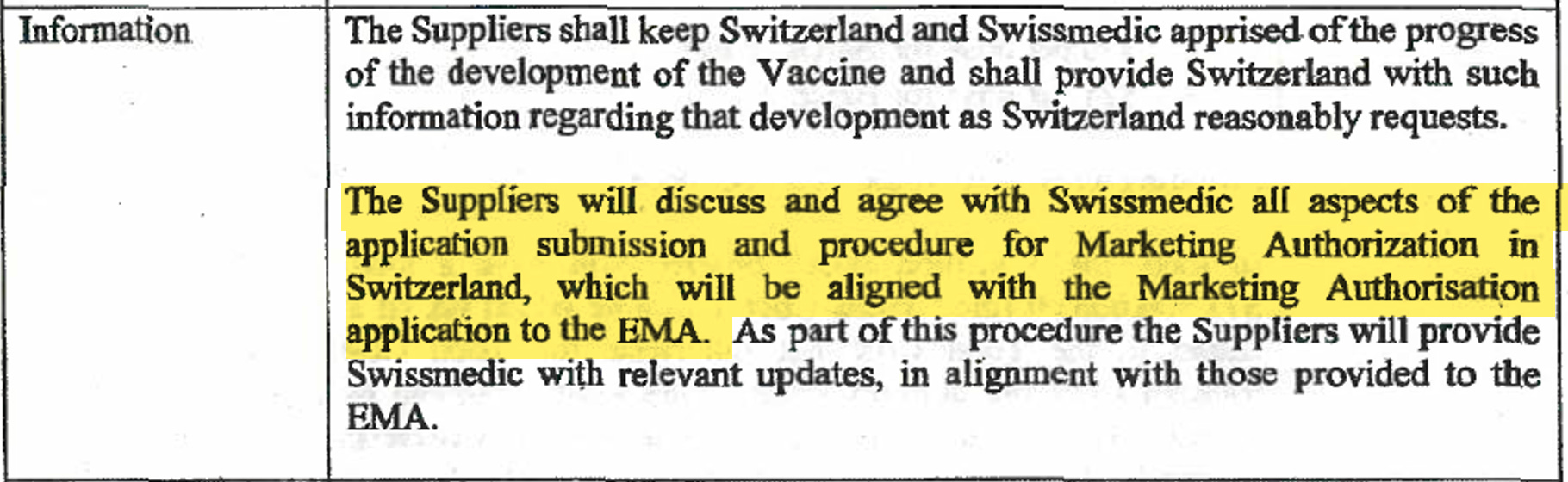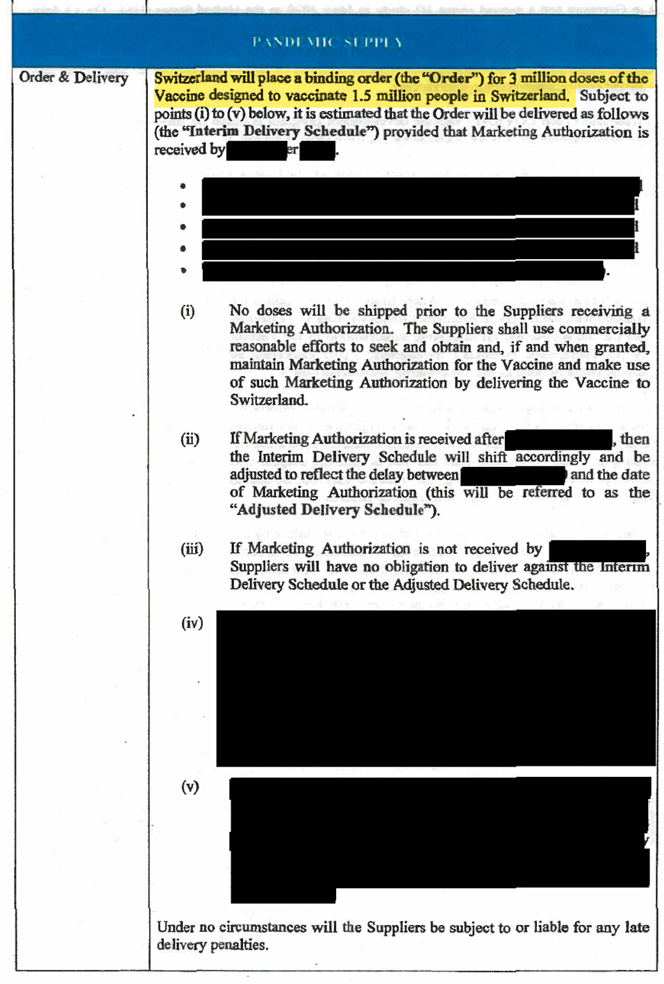 Dieses Dokument scheint ein Vorab-Vertrag und nicht der finale Vertrag zu sein. Die Schweiz bestellt mit diesem Vertrag ein Produkt, dass noch in der klinischen Phase der Testung ist und von dem zum Zeitpunkt des Vertrags nicht klar ist, ob es überhaupt zugelassen wird. Der Hersteller stellt in diesem Vertrag auf Seite 1 sicher, dass er nicht belangt wird, wenn er nicht liefern kann, selbst wenn das Produkt zu gelassen werden sollte. Also keine Konventionalstrafen bei nicht Lieferung.