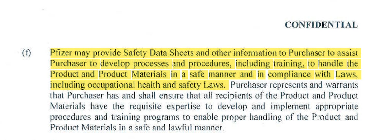 Pfizer kann dem Käufer Sicherheitsdatenblätter und andere Informationen zur Verfügung stellen, um ihn bei der Entwicklung von Prozessen und Verfahren – einschließlich Schulungen – zu unterstützen, die einen sicheren Umgang mit dem Produkt und den Produktmaterialien unter Einhaltung der geltenden Gesetze, einschließlich der Arbeitsschutzgesetze, gewährleisten. Der Käufer versichert und gewährleistet, dass er über das erforderliche Fachwissen verfügt und sicherstellen wird, dass alle Empfänger des Produkts und der Produktmaterialien über das erforderliche Fachwissen verfügen, um geeignete Verfahren und Schulungsprogramme zu entwickeln und umzusetzen, die einen ordnungsgemäßen Umgang mit dem Produkt und den Produktmaterialien auf sichere und gesetzeskonforme Weise ermöglichen.