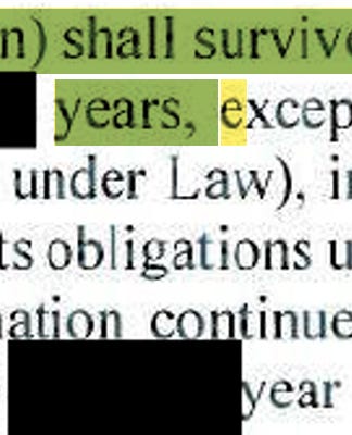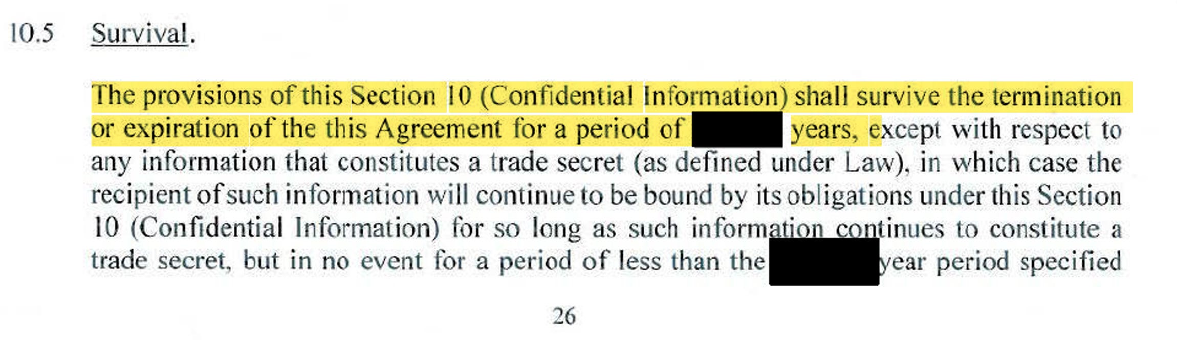Die Bestimmungen dieses Abschnitts 10 (Vertrauliche Informationen) bleiben auch nach Beendigung oder Ablauf dieser Vereinbarung für einen Zeitraum von xxxx Jahren bestehen,