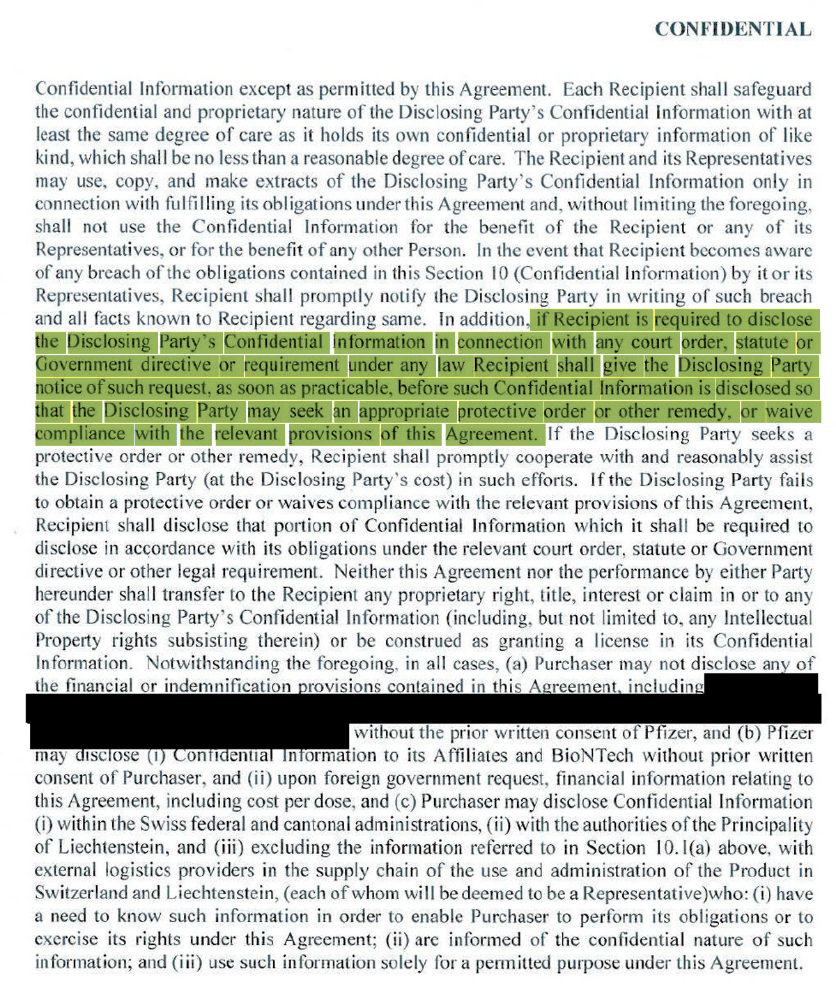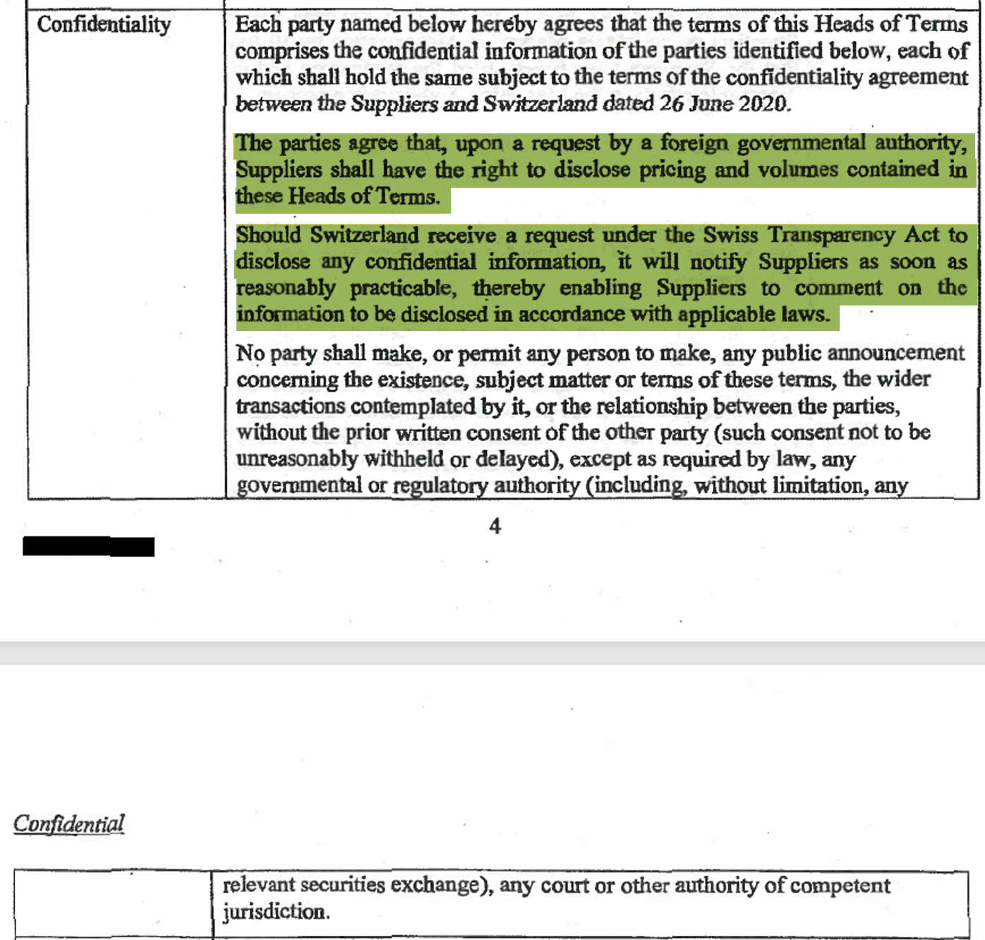 Sollte die Schweiz im Rahmen des Schweizer Transparenzgesetzes eine Aufforderung zur Offenlegung vertraulicher Informationen erhalten, wird sie die Lieferanten so bald wie möglich darüber in Kenntnis setzen, damit diese gemäß den geltenden Gesetzen zu den offenzulegenden Informationen Stellung nehmen können.
