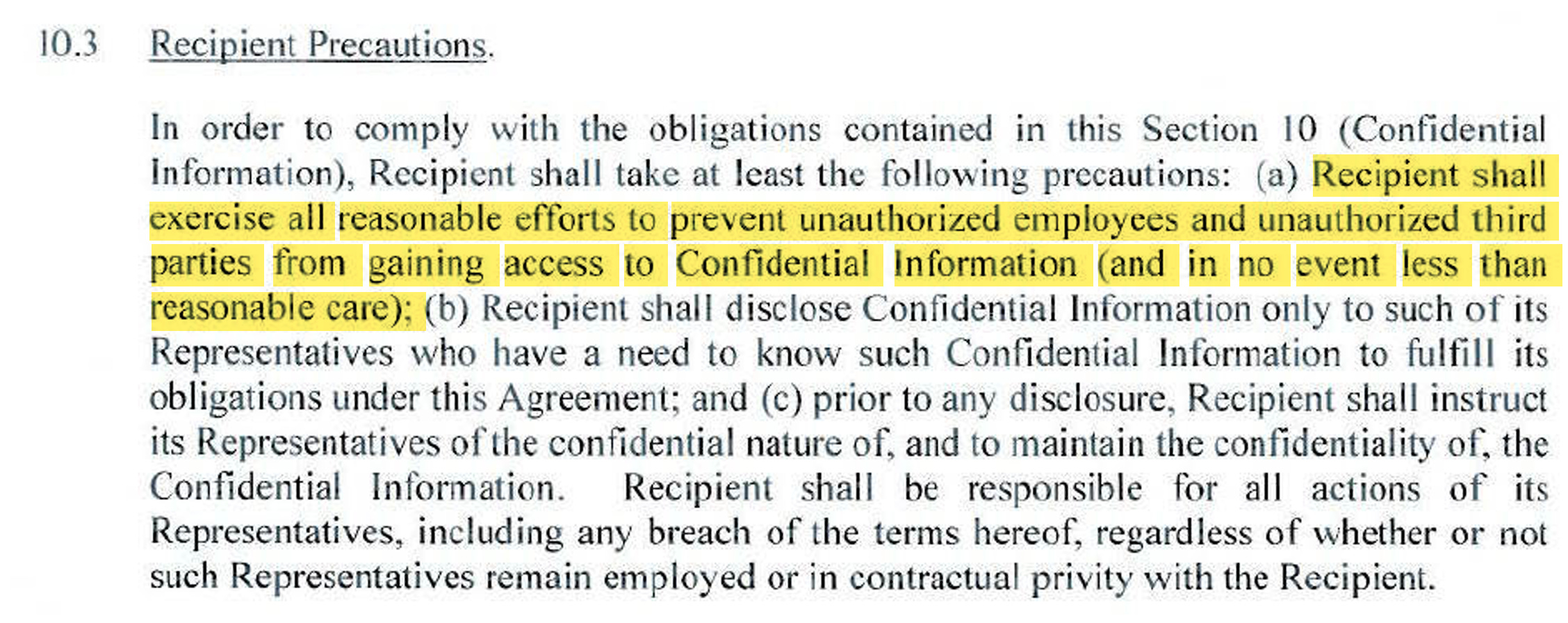 Der Empfänger hat alle zumutbaren Anstrengungen zu unternehmen, um zu verhindern, dass unbefugte Mitarbeiter und unbefugte Dritte Zugang zu vertraulichen Informationen erhalten (und dabei in jedem Fall die gebotene Sorgfalt walten zu lassen);