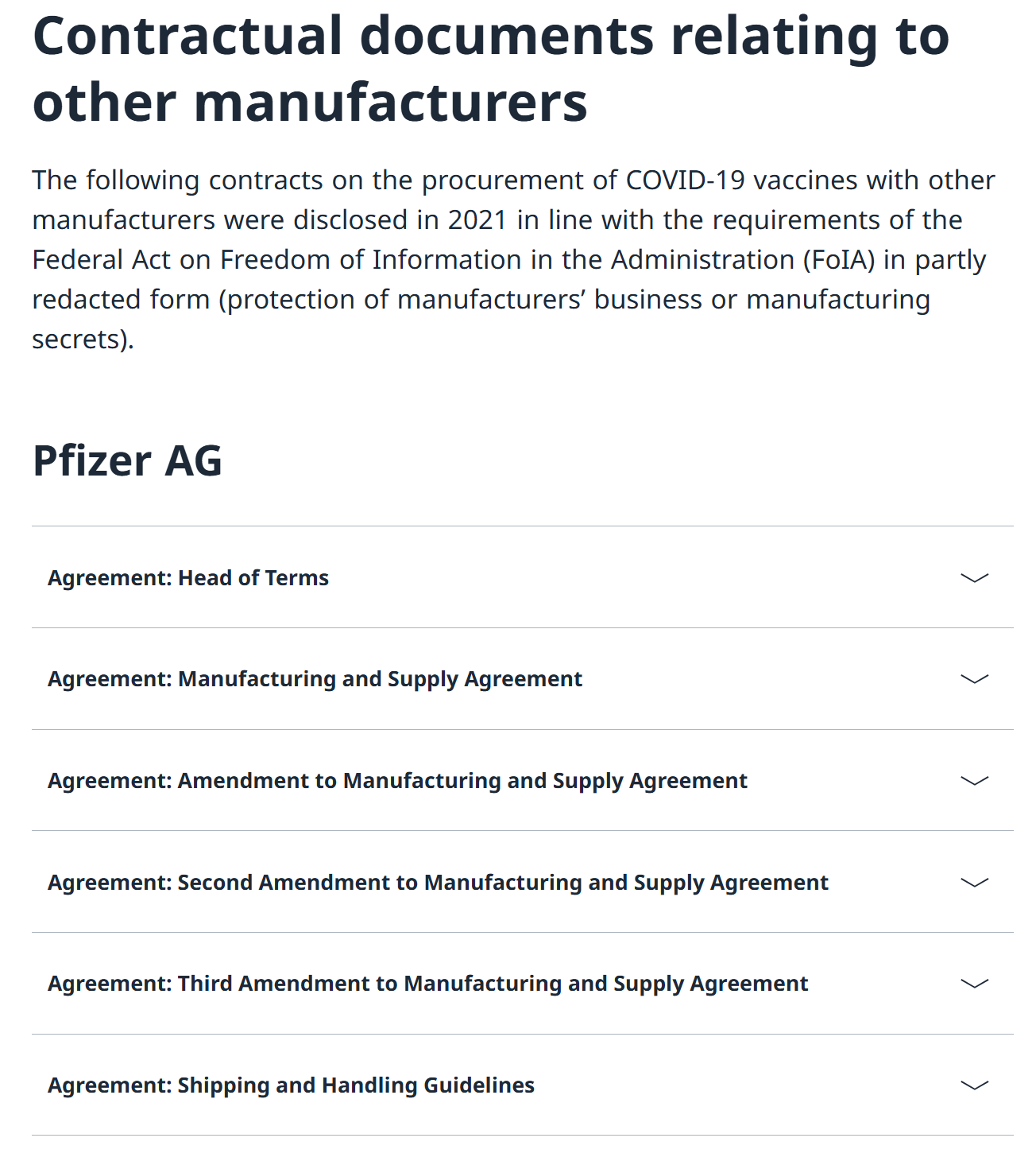 Der Vertrag besteht aus mehreren Teilen. Es sind bereits Pfizer EU Verträge öffentlich, die der italienische Sender RAI veröffentlicht hatte. Diese unterscheiden sich aber deutlich von den Schweizer Verträgen.