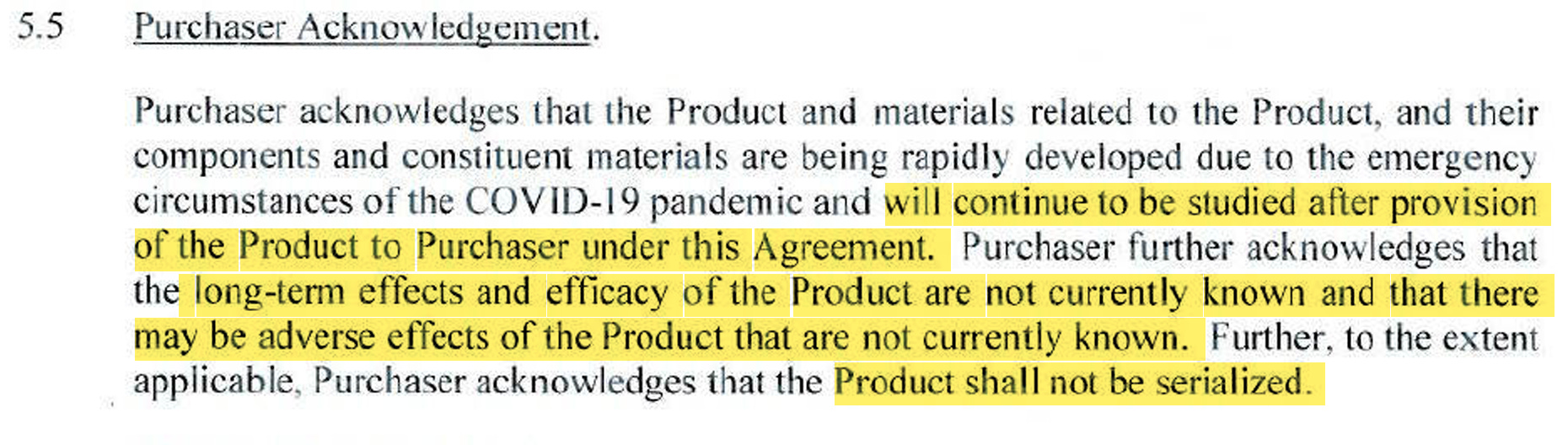 Der Käufer erkennt an, dass das Produkt und die mit dem Produkt verbundenen Materialien sowie deren Komponenten und Bestandteile aufgrund der Notlage im Zusammenhang mit der COVID-19-Pandemie in rascher Entwicklung stehen und auch nach der Lieferung des Produkts an den Käufer im Rahmen dieses Vertrags weiter untersucht werden. Der Käufer erkennt ferner an, dass die langfristigen Auswirkungen und die Wirksamkeit des Produkts derzeit nicht bekannt sind und dass das Produkt möglicherweise Nebenwirkungen haben kann, die derzeit nicht bekannt sind. Soweit zutreffend, erkennt der Käufer außerdem an, dass das Produkt nicht serialisiert wird.