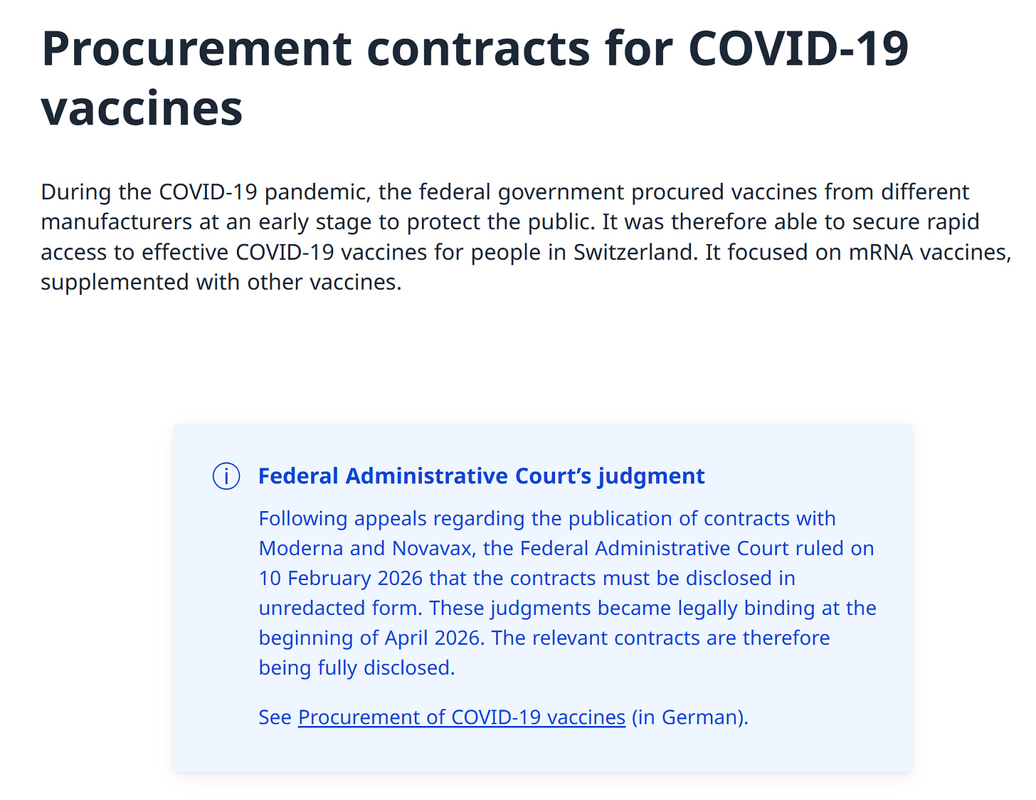 Nach jahrelangem Rechtsstreit hat das Bundesamt für Gesundheit (BAG) am 16. April 2026 die teilweise ungeschwärzten Verträge zur Beschaffung von COVID-19-Impfstoffen veröffentlicht. Grundlage war das Urteil des Bundesverwaltungsgerichts vom Februar 2026.