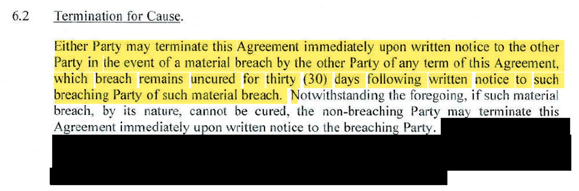 Jede Partei kann diesen Vertrag nach schriftlicher Mitteilung an die andere Partei mit sofortiger Wirkung kündigen, falls die andere Partei gegen eine Bestimmung dieses Vertrags in erheblicher Weise verstößt und dieser Verstoß auch dreißig (30) Tage nach schriftlicher Mitteilung an die vertragsbrüchige Partei über diesen erheblichen Verstoß nicht behoben wurde. Ungeachtet des Vorstehenden kann die nicht vertragsbrüchige Partei diesen Vertrag nach schriftlicher Mitteilung an die vertragsbrüchige Partei mit sofortiger Wirkung kündigen, wenn ein solcher erheblicher Verstoß seiner Natur nach nicht behoben werden kann.