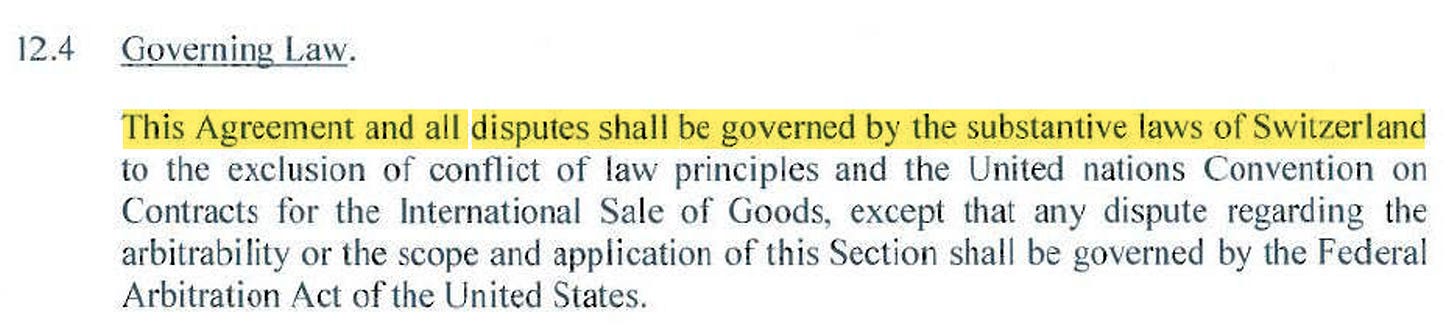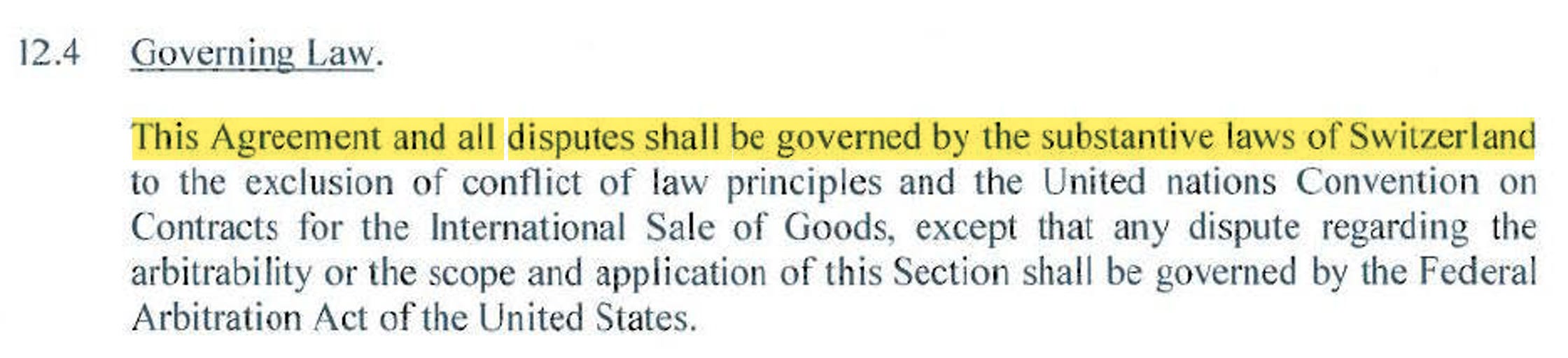 Diese Vereinbarung und alle Streitigkeiten unterliegen dem materiellen Recht der Schweiz unter Ausschluss der Kollisionsnormen und des Übereinkommens der Vereinten Nationen über Verträge über den internationalen Warenkauf, mit der Ausnahme, dass Streitigkeiten über die Schiedsfähigkeit oder den Geltungsbereich und die Anwendung dieses Abschnitts dem Federal Arbitration Act der Vereinigten Staaten unterliegen.