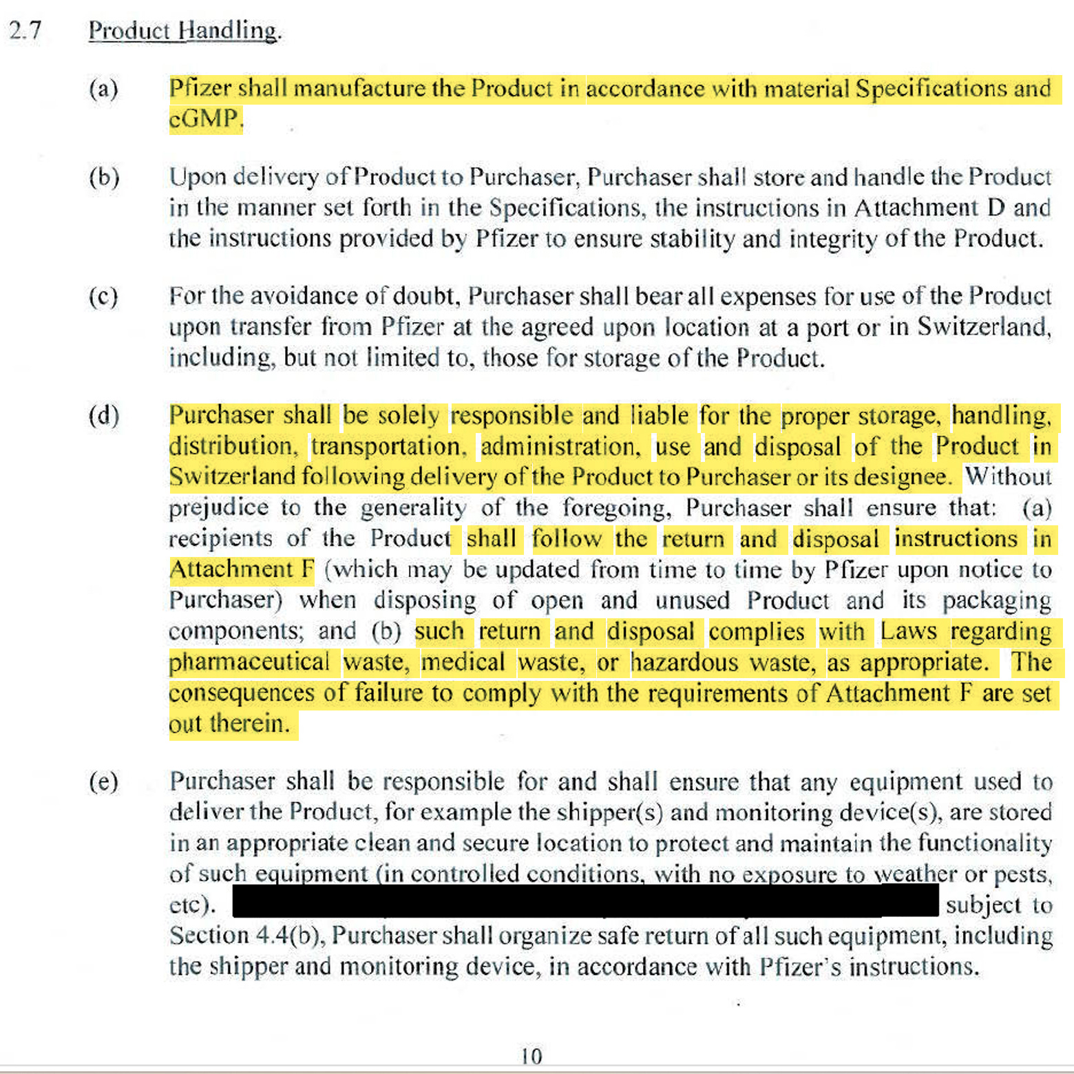 Der Käufer trägt die alleinige Verantwortung und Haftung für die ordnungsgemäße Lagerung, Handhabung, Verteilung, Beförderung, Verabreichung, Verwendung und Entsorgung des Produkts in der Schweiz nach dessen Lieferung an den Käufer oder eine von ihm benannte Person. Unbeschadet der Allgemeingültigkeit des Vorstehenden hat der Käufer sicherzustellen, dass: (a) die Empfänger des Produkts bei der Entsorgung von geöffneten und unbenutzten Produkten und deren Verpackungskomponenten die Rückgabe- und Entsorgungsanweisungen in Anhang F befolgen (die von Pfizer nach Benachrichtigung des Käufers von Zeit zu Zeit aktualisiert werden können); und (b) diese Rückgabe und Entsorgung den geltenden Gesetzen über Arzneimittelabfälle, medizinische Abfälle oder gefährliche Abfälle entspricht. Die Folgen einer Nichteinhaltung der Anforderungen von Anhang F sind darin dargelegt.