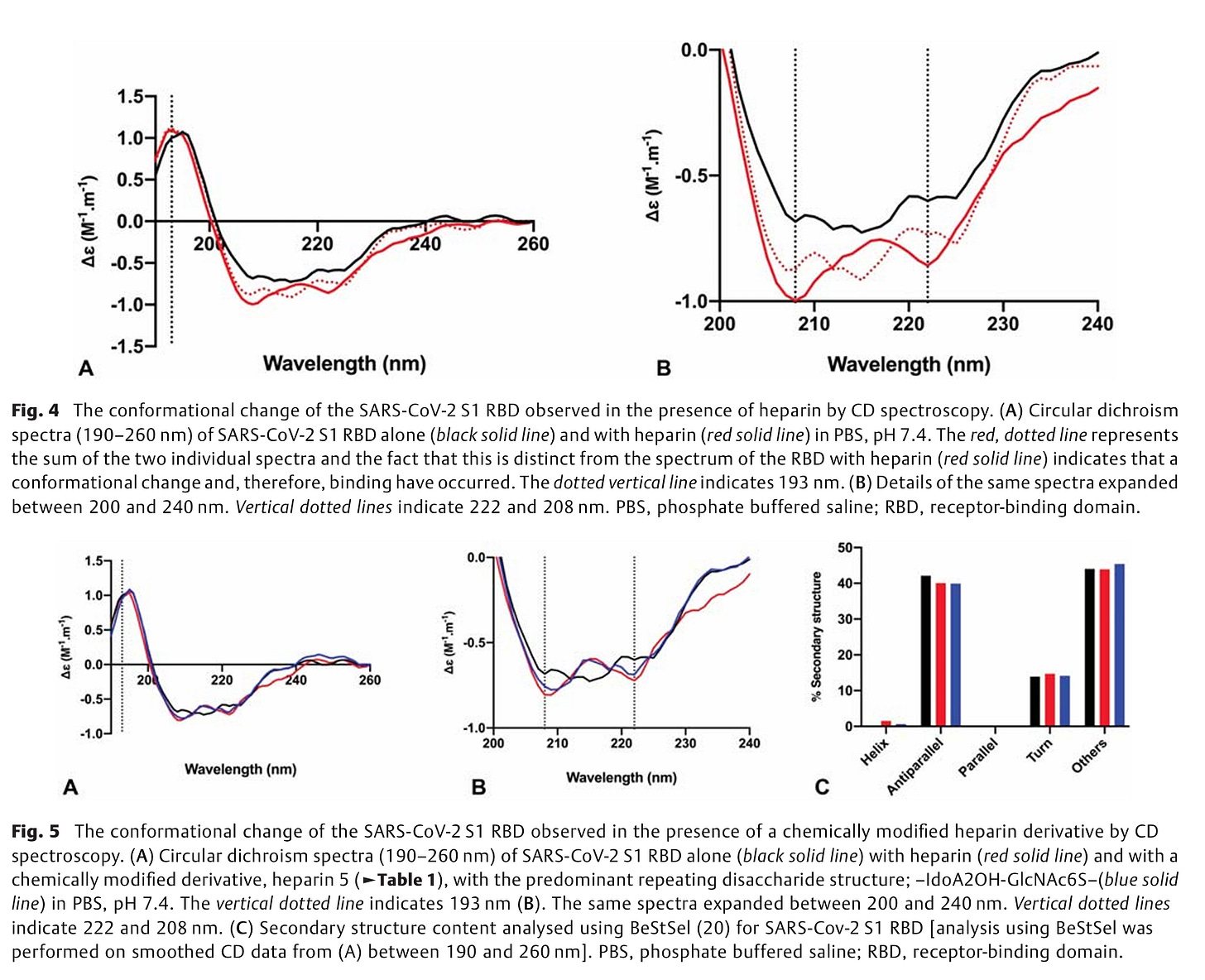 Neben den bereits bekannten Biacore Messungen, machten diese Autoren auch Zirkulardichroismus-Spektroskopie (CD-Spektroskopie), konnten also zeigen, dass die Bindung des Spike-Proteins an Heparin, die Struktur des Spike-Proteins veränderten. Das Spike-Protein wurde also nicht nur gebunden, es wurde verbogen.