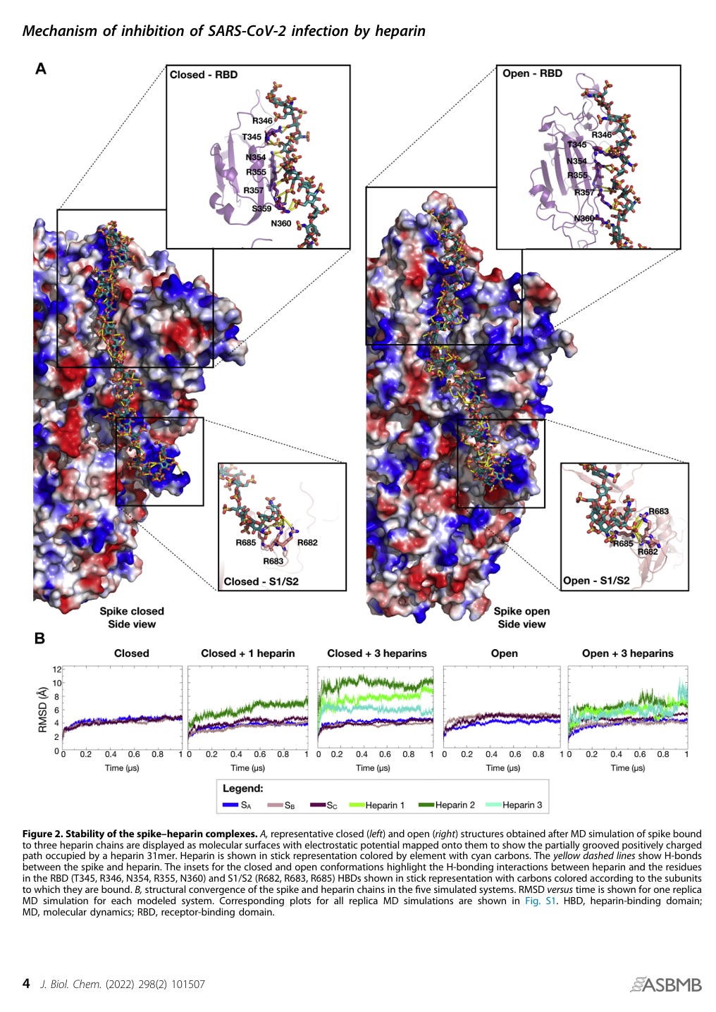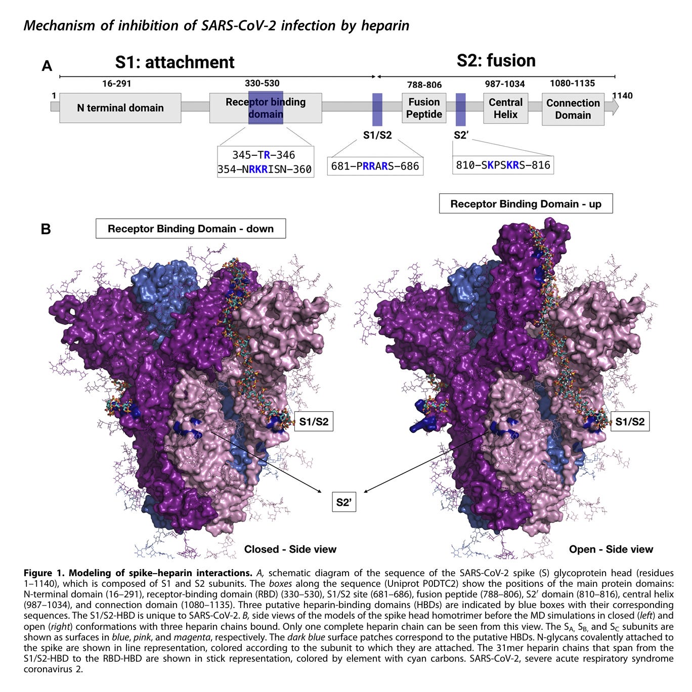 Paiardi G, Richter S, Oreste P, Urbinati C, Rusnati M, Wade RC. The binding of heparin to spike glycoprotein inhibits SARS-CoV-2 infection by three mechanisms. J Biol Chem. 2022 Feb;298(2):101507. doi: 10.1016/j.jbc.2021.101507. Epub 2021 Dec 18. PMID: 34929169; PMCID: PMC8683219. https://pubmed.ncbi.nlm.nih.gov/34929169/