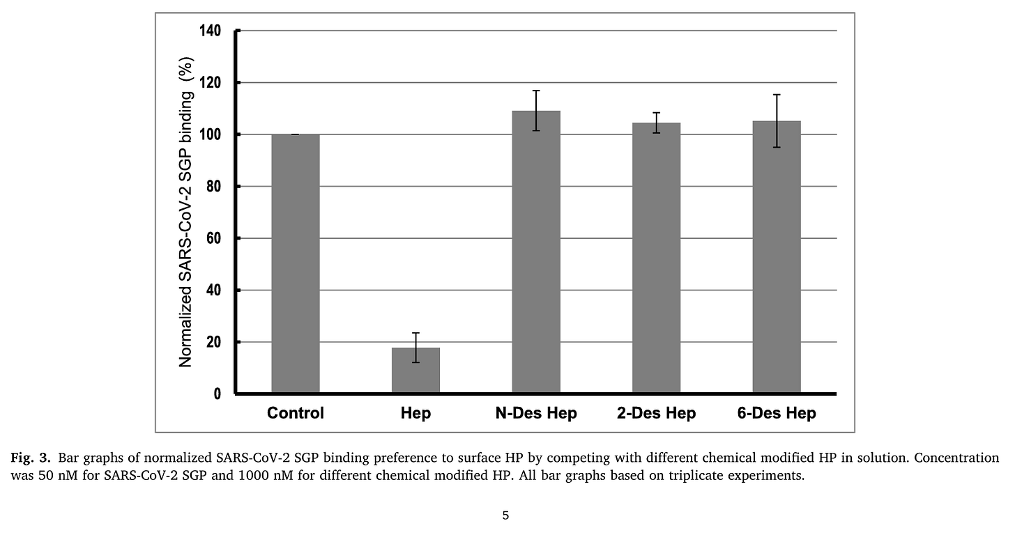 Kim SY, Jin W, Sood A, Montgomery DW, Grant OC, Fuster MM, Fu L, Dordick JS, Woods RJ, Zhang F, Linhardt RJ. Characterization of heparin and severe acute respiratory syndrome-related coronavirus 2 (SARS-CoV-2) spike glycoprotein binding interactions. Antiviral Res. 2020 Sep;181:104873. doi: 10.1016/j.antiviral.2020.104873. Epub 2020 Jul 10. PMID: 32653452; PMCID: PMC7347485. https://pubmed.ncbi.nlm.nih.gov/32653452/