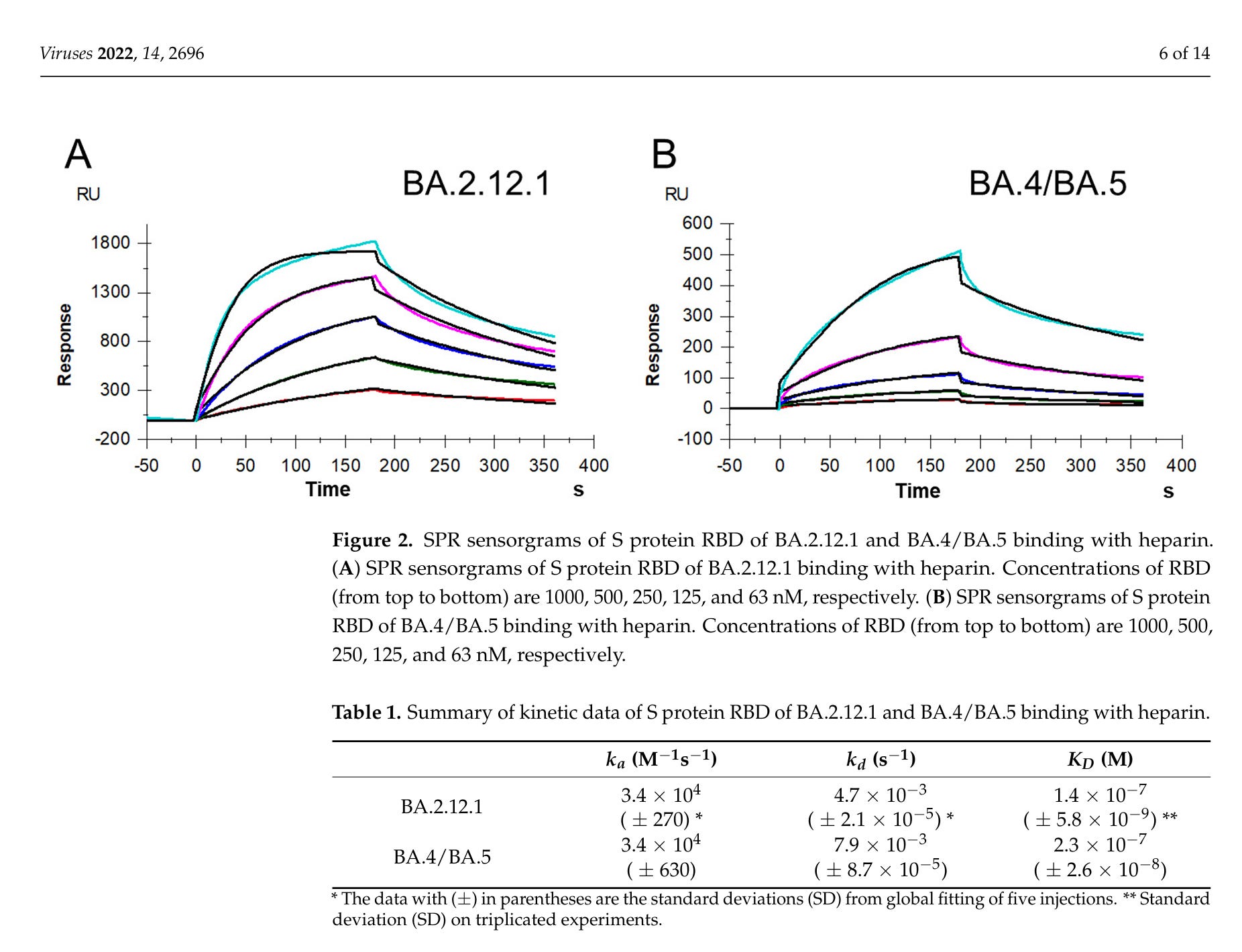 “Mutationen im RBD-Bereich des SARS-CoV-2-S-Proteins könnten die Bindung an HS/Heparin beeinflussen. Die SPR-Analyse ergab, dass die Bindungsaffinität (KD) von Omi-Cron BA.2.12.1 und BA.4/BA.5 im Nanomolarbereich lag, was etwas stärker war als bei der Wildtyp-Variante und mit der von Delta und Omicron B.1.1.529 vergleichbar war. “