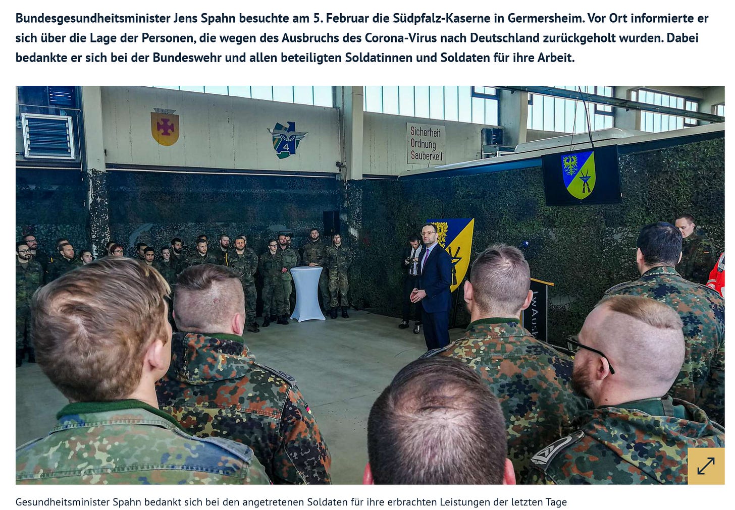 Wenige Tage später, am 05. Februar 2020, besuchte ich die Südpfalz Kaserne. Ich wollte mir selbst ein Bild der Lage machen und die Gelegenheit nutzen, den Helfern von der Bundeswehr und dem DRK im Namen der Bundesregierung offiziell zu danken. (S. 61)