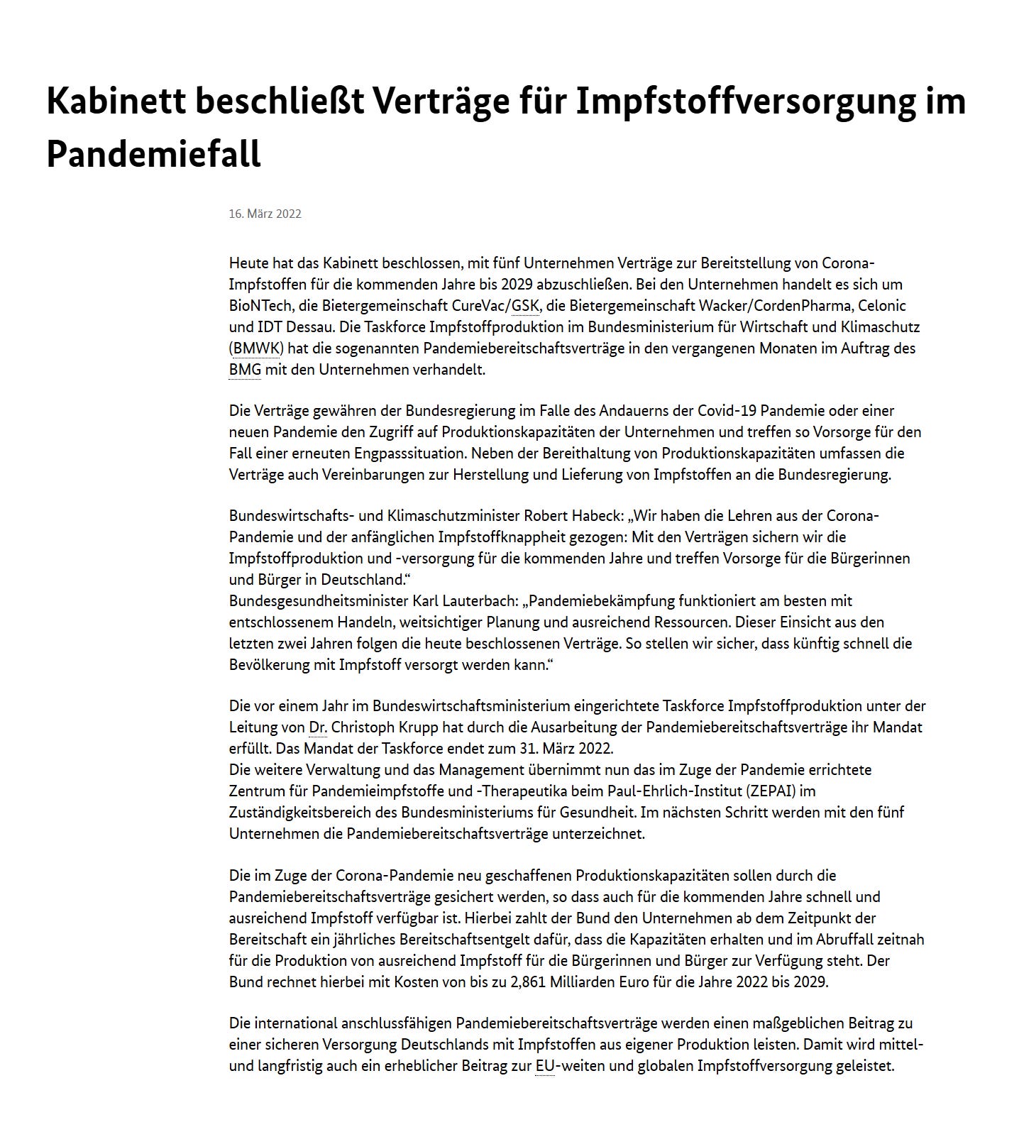 Nun macht es wenig Sinn, wenn ein Staat selber industrielle Produktionsanlagen vorhält oder betreibt. Das können private Unternehmen in aller Regel besser. Daher wurde ein Konzept entwickelt, mit dem in einer Ausschreibung Impfstoffhersteller als Vertragspartner gefunden werden sollen, die sich verpflichten, bestimmte Produktionskapazitäten so vorzuhalten, dass die Bundesregierung sie im Ernstfall in kurzer Frist abrufen und zur Herstellung eines gerade dringlich benötigten Impfstoffs nutzen kann. Im Gegenzug erhalten die Hersteller dafür eine jährliche Gebühr vom Staat. Damit war die Idee der Pandemiebereitschaftsverträge geboren. Nach vielen Vorarbeiten und einem monatelangen Ausschreibungsprozess konnte die neue Bundesregierung auf dieser Basis im Februar 2022 die ersten fünf dieser Verträge abschließen. (S. 81)