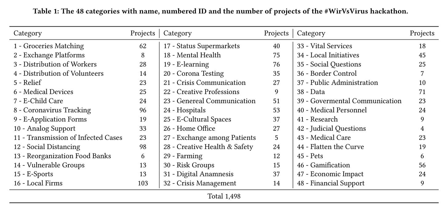 Haesler, S., Schmid, S., & Reuter, C. (2020). Crisis Volunteering Nerds: Three Months After COVID-19 Hackathon #WirVsVirus. Conference: MobileHCI ’20: 22nd International Conference on Human-Computer Interaction With Mobile Devices and Services, 1–5. https://doi.org/10.1145/3406324.3424584 https://www.researchgate.net/publication/349614808_Crisis_Volunteering_Nerds_Three_Months_After_COVID-19_Hackathon_WirVsVirus#:~:text=Abstract%20and%20Figures,An%2D%20droid%20and%20iOS%20apps.