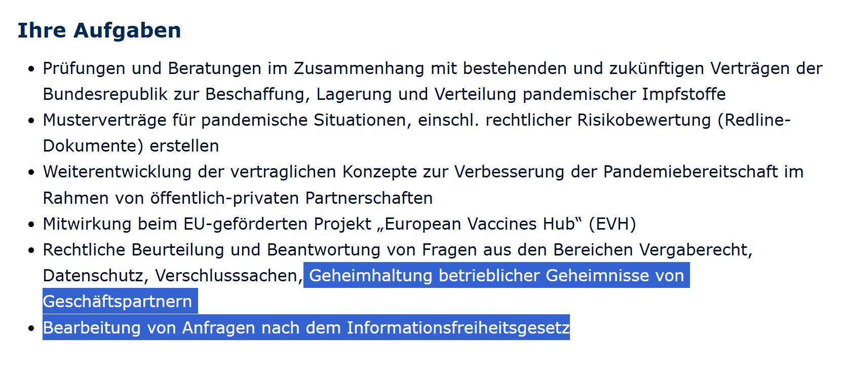 Obwohl nur Verschwörungstheoretiker behaupten würden, dass die nächste “Pandemie” schon in Planung ist, bekommt die Person, die auf dieser Stelle arbeiten wird, jetzt schon genug zu tun, um bis zum 31.12.2027 (bis dahin ist die Stelle befristet) in Vollzeit das obige Tätigkeitsprofil zu bedienen.”