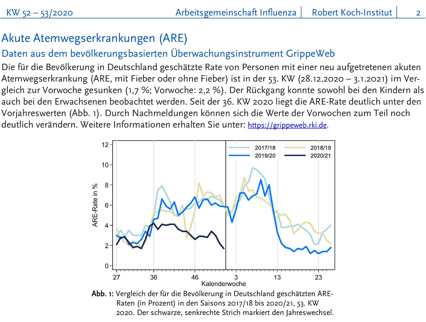 ARE-Wochenbericht des RKI Aktuelles zu akuten respiratorischen Erkrankungen 5. Kalenderwoche (27.1. bis 2.2.2025) https://edoc.rki.de/bitstream/handle/176904/12389/ARE_Wochenbericht_KW05_2025.pdf