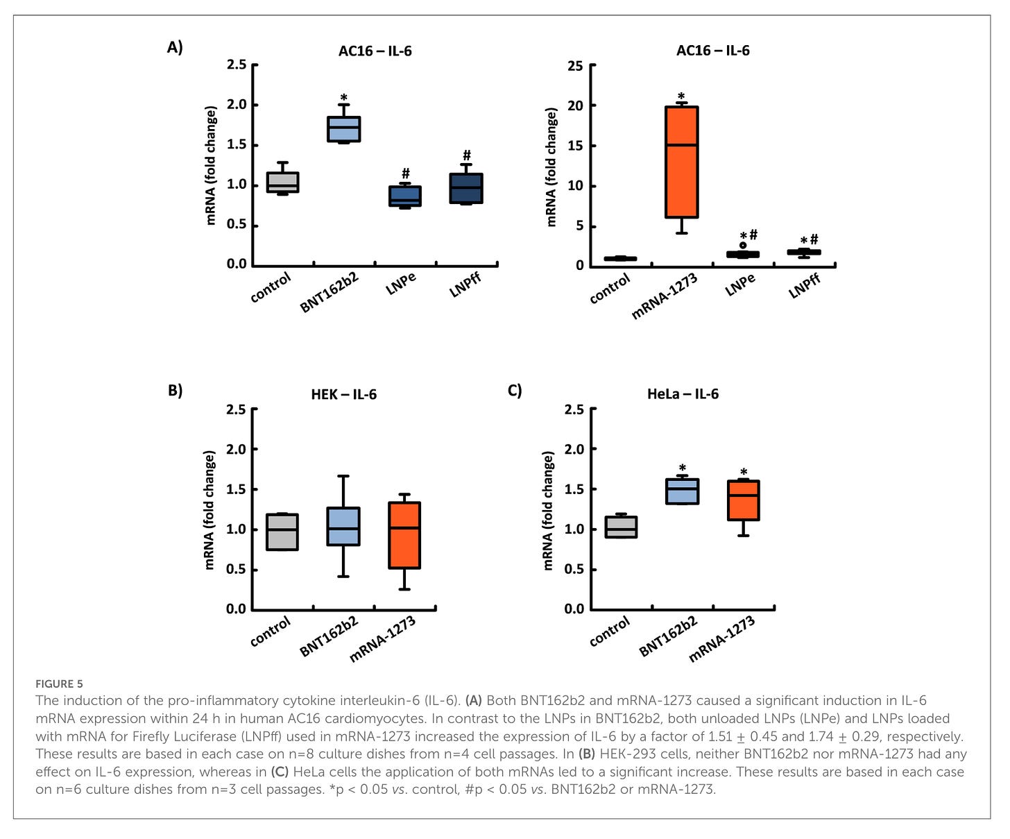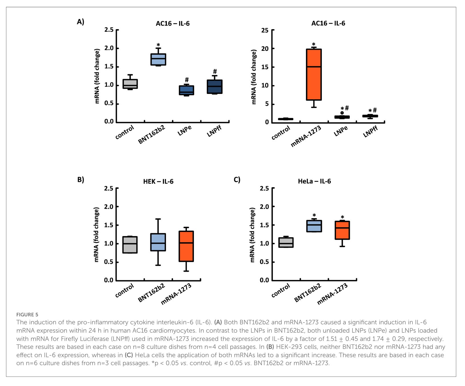 Auch der Anstieg von IL-6 ist Zelltypabhängig. In AC16 und HeLa Zellen stieg IL-6 an, in HEK-293 Zellen nicht. mRNA-1273 war in AC16 Zellen sowohl leer als auch beladen inflammatorisch, d.h. IL-6 stieg an. Bei Moderna ist das Lipid selbst bereits inflammatorisch, was auch im Moderna eigenen Review so bestätigt wird.