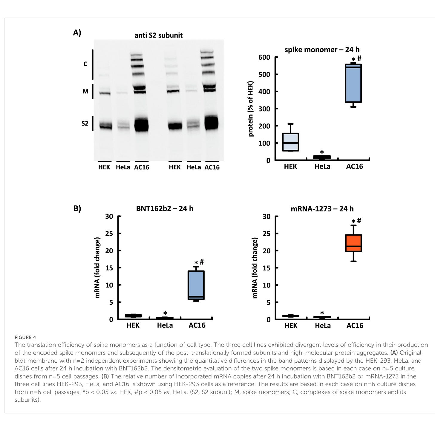 Die Translationseffizienz von Spike-Monomeren als Funktion des Zelltyps. Die drei Zelllinien zeigten unterschiedliche Effizienzgrade bei der Produktion der kodierten Spike-Monomere und anschließend der posttranslational gebildeten Untereinheiten und hochmolekularen Proteinaggregate. (A) Original-Blot-Membran mit n = 2 unabhängigen Experimenten, die die quantitativen Unterschiede in den Bandenmustern zeigen, die von den HEK-293-, HeLa- und AC16-Zellen nach 24-stündiger Inkubation mit BNT162b2 angezeigt werden. Die densitometrische Auswertung der beiden Spike-Monomere basiert in jedem Fall auf n = 5 Kulturplatten aus n = 5 Zellpassagen. (B) Die relative Anzahl der eingebauten mRNA-Kopien nach 24-stündiger Inkubation mit BNT162b2 oder mRNA-1273 in den drei Zelllinien HEK-293, HeLa und AC16 wird unter Verwendung von HEK-293-Zellen als Referenz dargestellt. Die Ergebnisse basieren jeweils auf n=6 Kulturplatten aus n=6 Zellpassagen. *p < 0,05 vs. HEK, #p < 0,05 vs. HeLa. (S2, S2-Untereinheit; M, Spike-Monomere; C, Komplexe aus Spike-Monomeren und ihren Untereinheiten).