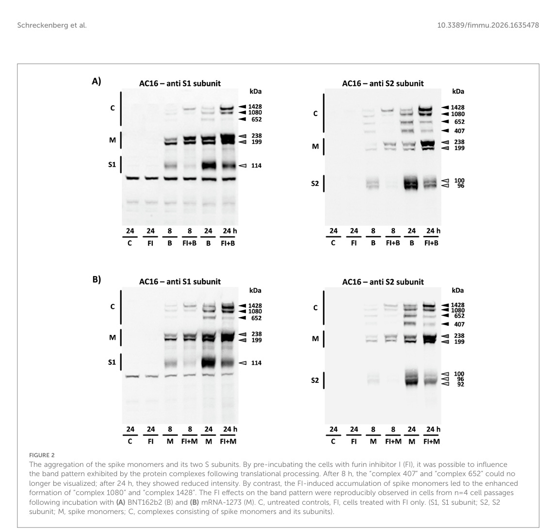 Etwa 8 Stunden nach der Verabreichung von BNT162b2 bzw. mRNA-1273 entstanden in den Zellen hochmolekulare Komplexe aufgrund der Bildung kovalenter Bindungen zwischen dem Spike-Monomer und seinen S1- oder S2-Untereinheiten. Die Zusammensetzung dieser Proteinkomplexe wurde in n=6 unabhängigen Zellpassagen untersucht. Sowohl das Molekulargewicht als auch die Bandenintensität dieser Komplexe zeigten ein konsistentes Muster. Dementsprechend kann eine zufällige Aggregation ausgeschlossen werden (siehe Abbildungen 1A, B).