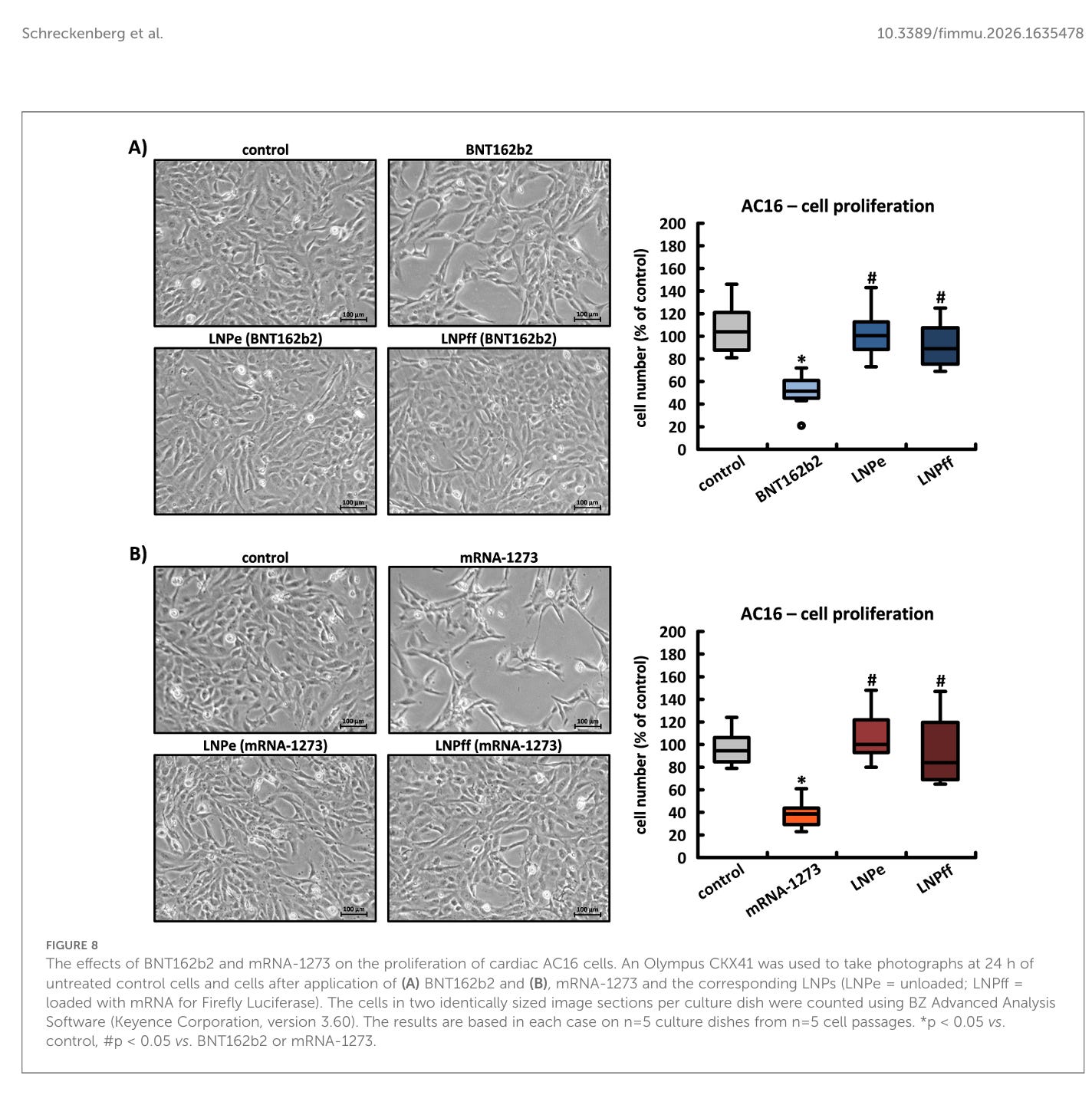 Die Auswirkungen von BNT162b2 und mRNA-1273 auf die Proliferation von kardialen AC16-Zellen. Mit einem Olympus CKX41 wurden nach 24 Stunden Fotos von unbehandelten Kontrollzellen und Zellen nach Anwendung von (A) BNT162b2 und (B) mRNA-1273 und den entsprechenden LNPs (LNPe = unbeladen; LNPff = beladen mit mRNA für Firefly-Luciferase) aufgenommen. Die Zellen in zwei identisch großen Bildausschnitten pro Kulturplatte wurden mit der BZ Advanced Analysis Software (Keyence Corporation, Version 3.60) gezählt. Die Ergebnisse basieren jeweils auf n = 5 Kulturplatten aus n = 5 Zellpassagen. *p < 0,05 vs. Kontrolle, #p < 0,05 vs. BNT162b2 oder mRNA-1273.