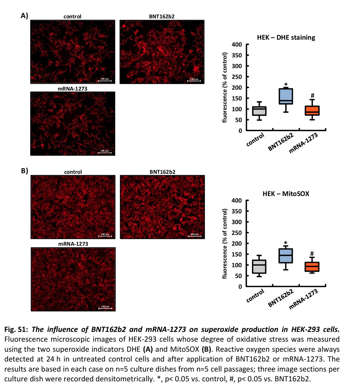 Abb. S1: Der Einfluss von BNT162b2 und mRNA-1273 auf die Superoxidproduktion in HEK-293-Zellen. Fluoreszenzmikroskopische Aufnahmen von HEK-293-Zellen, deren oxidativer Stress mit den beiden Superoxid-Indikatoren DHE (A) und MitoSOX (B) gemessen wurde. Reaktive Sauerstoffspezies wurden immer nach 24 Stunden in unbehandelten Kontrollzellen und nach Anwendung von BNT162b2 oder mRNA-1273 nachgewiesen. Die Ergebnisse basieren jeweils auf n=5 Kulturplatten aus n=5 Zellpassagen; drei Bildausschnitte pro Kulturplatte wurden densitometrisch erfasst. *, p< 0,05 vs. Kontrolle, #, p< 0,05 vs. BNT162b2.