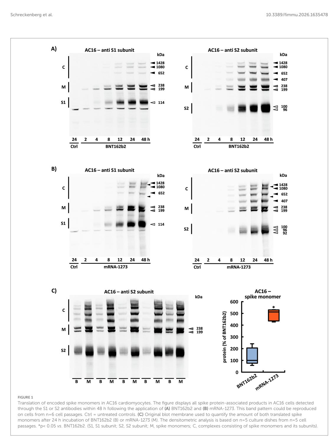 Translation von kodierten Spike-Monomeren in AC16-Kardiomyozyten. Die Abbildung zeigt alle Spike-Protein-assoziierten Produkte in AC16-Zellen, die innerhalb von 48 Stunden nach der Anwendung von (A) BNT162b2 und (B) mRNA-1273 durch die Antikörper S1 oder S2 nachgewiesen wurden. Dieses Bandenmuster konnte auf Zellen aus n=6 Zellpassagen reproduziert werden. Ctrl = unbehandelte Kontrollen. (C) Original-Blot-Membran, die zur Quantifizierung der Menge beider translatierter Spike-Monomere nach 24-stündiger Inkubation von BNT162b2 (B) oder mRNA-1273 (M) verwendet wurde. Die densitometrische Analyse basiert auf n = 5 Kulturplatten aus n = 5 Zellpassagen. *p< 0,05 vs. BNT162b2. (S1, S1-Untereinheit; S2, S2-Untereinheit; M, Spike-Monomere; C, Komplexe aus Spike-Monomeren und ihren Untereinheiten).