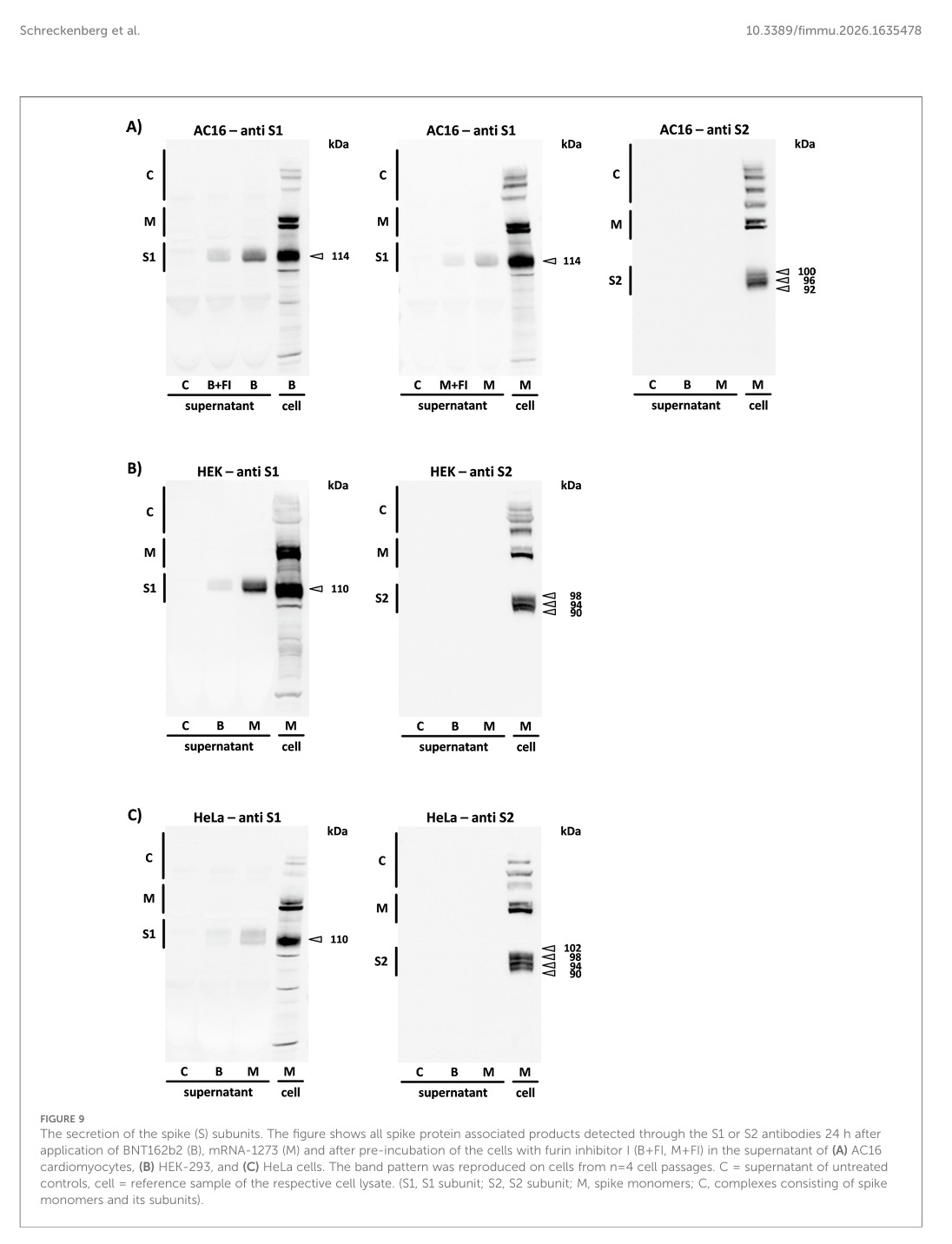 Die Sekretion der Spike (S)-Untereinheiten. Die Abbildung zeigt alle Spike-Protein-assoziierten Produkte, die 24 Stunden nach der Anwendung von BNT162b2 (B), mRNA-1273 (M) und nach Vorinkubation der Zellen mit Furin-Inhibitor I (B+FI, M+FI) im Überstand von (A) AC16-Kardiomyozyten, (B) HEK-293- und (C) HeLa-Zellen. Das Bandenmuster wurde auf Zellen aus n=4 Zellpassagen reproduziert. C = Überstand unbehandelter Kontrollen, Zelle = Referenzprobe des jeweiligen Zelllysats. (S1, S1-Untereinheit; S2, S2-Untereinheit; M, Spike-Monomere; C, Komplexe aus Spike-Monomeren und ihren Untereinheiten).