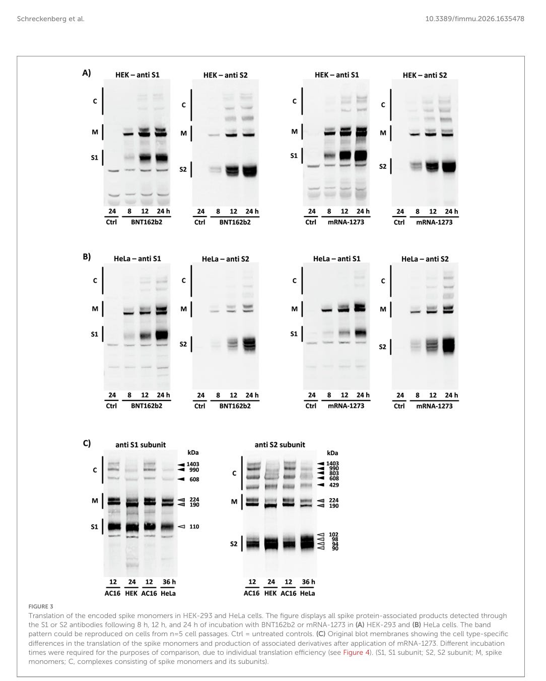Translation der kodierten Spike-Monomere in HEK-293- und HeLa-Zellen. Die Abbildung zeigt alle Spike-Protein-assoziierten Produkte, die nach 8, 12 und 24 Stunden Inkubation mit BNT162b2 oder mRNA-1273 in (A) HEK-293- und (B) HeLa-Zellen mittels der Antikörper S1 oder S2 nachgewiesen wurden. Das Bandenmuster konnte auf Zellen aus n = 5 Zellpassagen reproduziert werden. Ctrl = unbehandelte Kontrollen. (C) Original-Blot-Membranen, die die zelltypspezifischen Unterschiede bei der Translation der Spike-Monomere und der Produktion assoziierter Derivate nach Anwendung von mRNA-1273 zeigen. Aufgrund der individuellen Translationseffizienz waren für Vergleichszwecke unterschiedliche Inkubationszeiten erforderlich (siehe Abbildung 4). (S1, S1-Untereinheit; S2, S2-Untereinheit; M, Spike-Monomere; C, Komplexe aus Spike-Monomeren und ihren Untereinheiten).