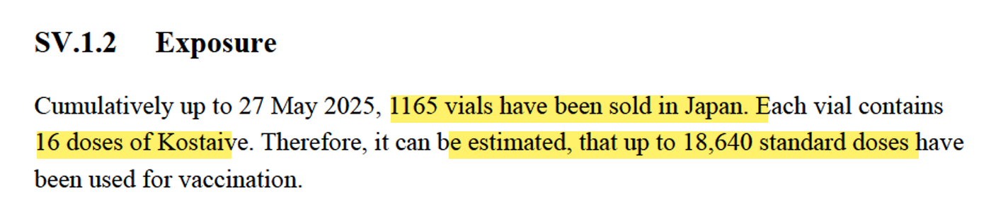 “Bis zum 27. Mai 2025 wurden in Japan insgesamt 1165 Ampullen verkauft. Jede Ampulle enthält 16 Dosen Kostaive. Daher lässt sich schätzen, dass bis zu 18.640 Standarddosen für Impfungen verwendet wurden.”