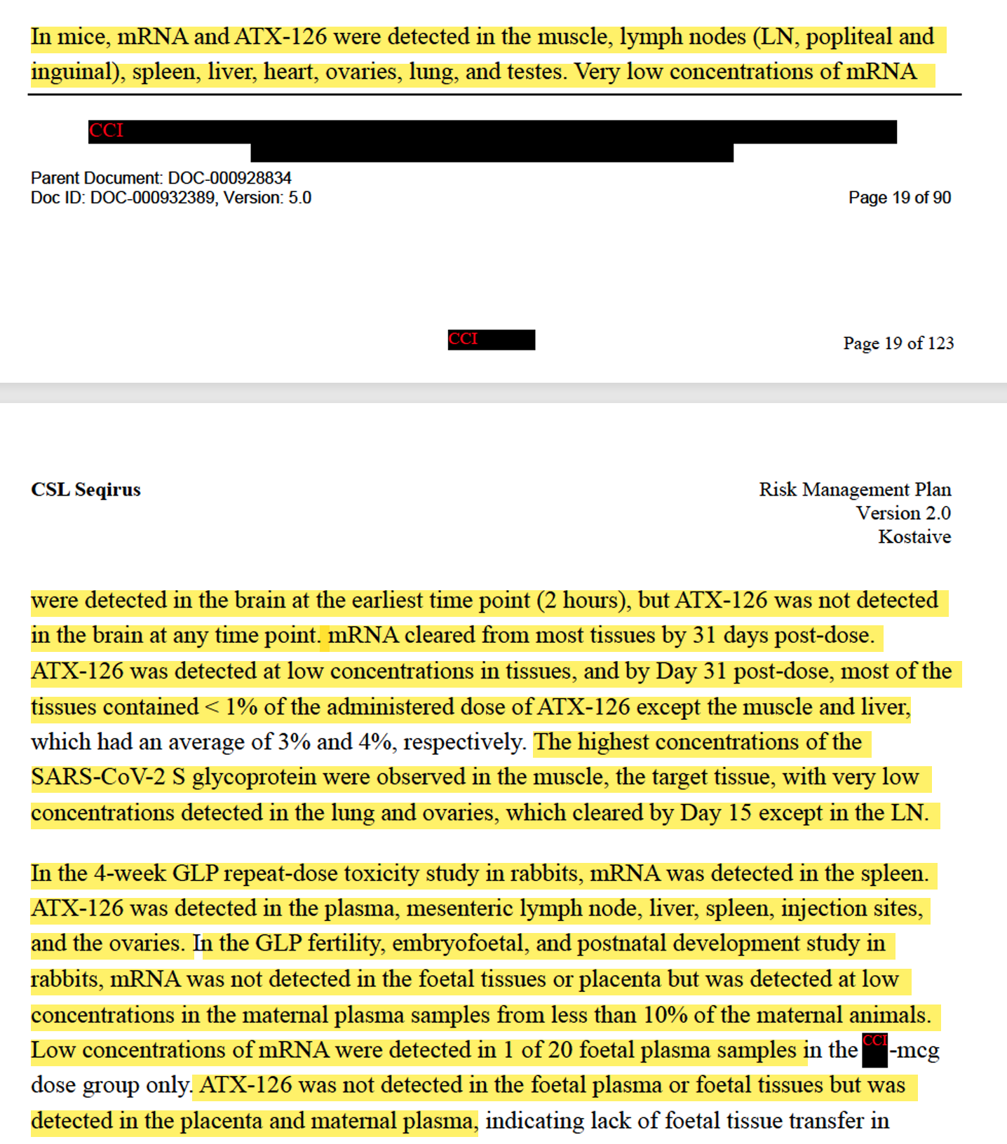 “Bei Mäusen wurden mRNA und ATX-126 im Muskel, in den Lymphknoten (LN, Kniekehlen- und Leistenlymphknoten), in der Milz, in der Leber, im Herzen, in den Eierstöcken, in der Lunge und in den Hoden nachgewiesen. Im Gehirn wurden zum frühesten Zeitpunkt (2 Stunden) sehr geringe Konzentrationen von mRNA nachgewiesen, ATX-126 wurde jedoch zu keinem Zeitpunkt im Gehirn nachgewiesen. Die mRNA war 31 Tage nach der Verabreichung aus den meisten Geweben abgebaut. ATX-126 wurde in geringen Konzentrationen in den Geweben nachgewiesen, und am Tag 31 nach der Verabreichung enthielten die meisten Gewebe < 1 % der verabreichten Dosis von ATX-126, mit Ausnahme der Muskeln und der Leber, die durchschnittlich 3 % bzw. 4 % aufwiesen. Die höchsten Konzentrationen des SARS-CoV-2-S-Glykoproteins wurden im Muskel, dem Zielgewebe, beobachtet, während in der Lunge und den Eierstöcken sehr geringe Konzentrationen nachgewiesen wurden, die bis zum 15. Tag abgebaut waren, außer in den LN. In der 4-wöchigen GLP-Studie zur Toxizität bei wiederholter Verabreichung an Kaninchen wurde mRNA in der Milz nachgewiesen. ATX-126 wurde im Plasma, in den Mesenteriallymphknoten, in der Leber, in der Milz, an den Injektionsstellen und in den Eierstöcken nachgewiesen. In der GLP-Studie zur Fertilität, Embryo-Fetal- und postnatalen Entwicklung bei Kaninchen wurde keine mRNA in den fötalen Geweben oder der Plazenta nachgewiesen, jedoch wurden geringe Konzentrationen in den mütterlichen Plasmaproben von weniger als 10 % der mütterlichen Tiere festgestellt. Niedrige Konzentrationen von mRNA wurden nur in 1 von 20 fetalen Plasmaproben der Bc-Dosisgruppe nachgewiesen. ATX-126 wurde nicht im fetalen Plasma oder in fetalen Geweben nachgewiesen, wohl aber in der Plazenta und im mütterlichen Plasma, was auf einen fehlenden Transfer in das fetale Gewebe bei geimpften Muttertieren hindeutet.”