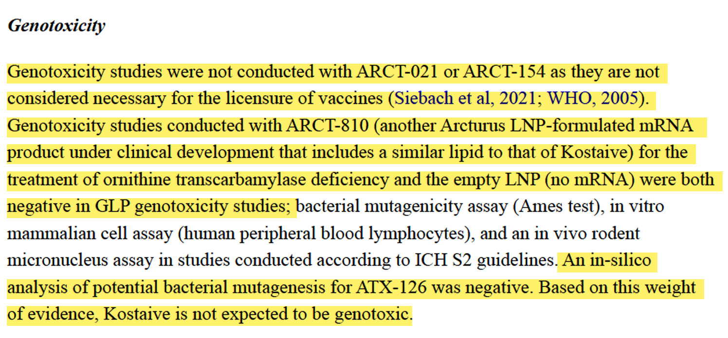 Es wurden keine Genotoxizitätsstudien mit ARCT-021 oder ARCT-154 durchgeführt, da diese für die Zulassung von Impfstoffen nicht als erforderlich angesehen werden (Siebach et al., 2021; WHO, 2005). Genotoxizitätsstudien, die mit ARCT-810 (einem weiteren mRNA-Produkt von Arcturus in klinischer Entwicklung, das ein ähnliches Lipid wie Kostaive enthält) zur Behandlung von Ornithintranscarbamylase-Mangel und dem leeren LNP (ohne mRNA) durchgeführt wurden, fielen in GLP-konformen Genotoxizitätsstudien beide negativ aus; bakterieller Mutagenitätstest (Ames-Test), In-vitro-Test an Säugetierzellen (menschliche periphere Blutlymphozyten) und ein In-vivo-Mikronukleustest an Nagetieren in Studien, die gemäß den ICH-S2-Richtlinien durchgeführt wurden. Eine In-silico-Analyse der potenziellen bakteriellen Mutagenität für ATX-126 war negativ. Auf der Grundlage dieser Beweislage ist nicht zu erwarten, dass Kostaive genotoxisch ist.